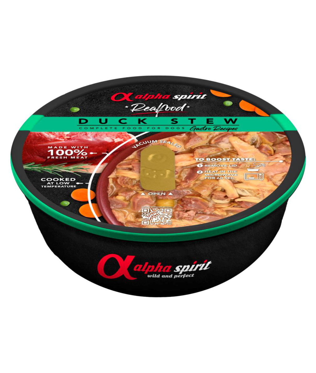 Alpha Spirit vådfoder – And indeholder saftig andekød som den primære proteinkilde, hvilket giver en rig og velsmagende oplevelse for din hund.
