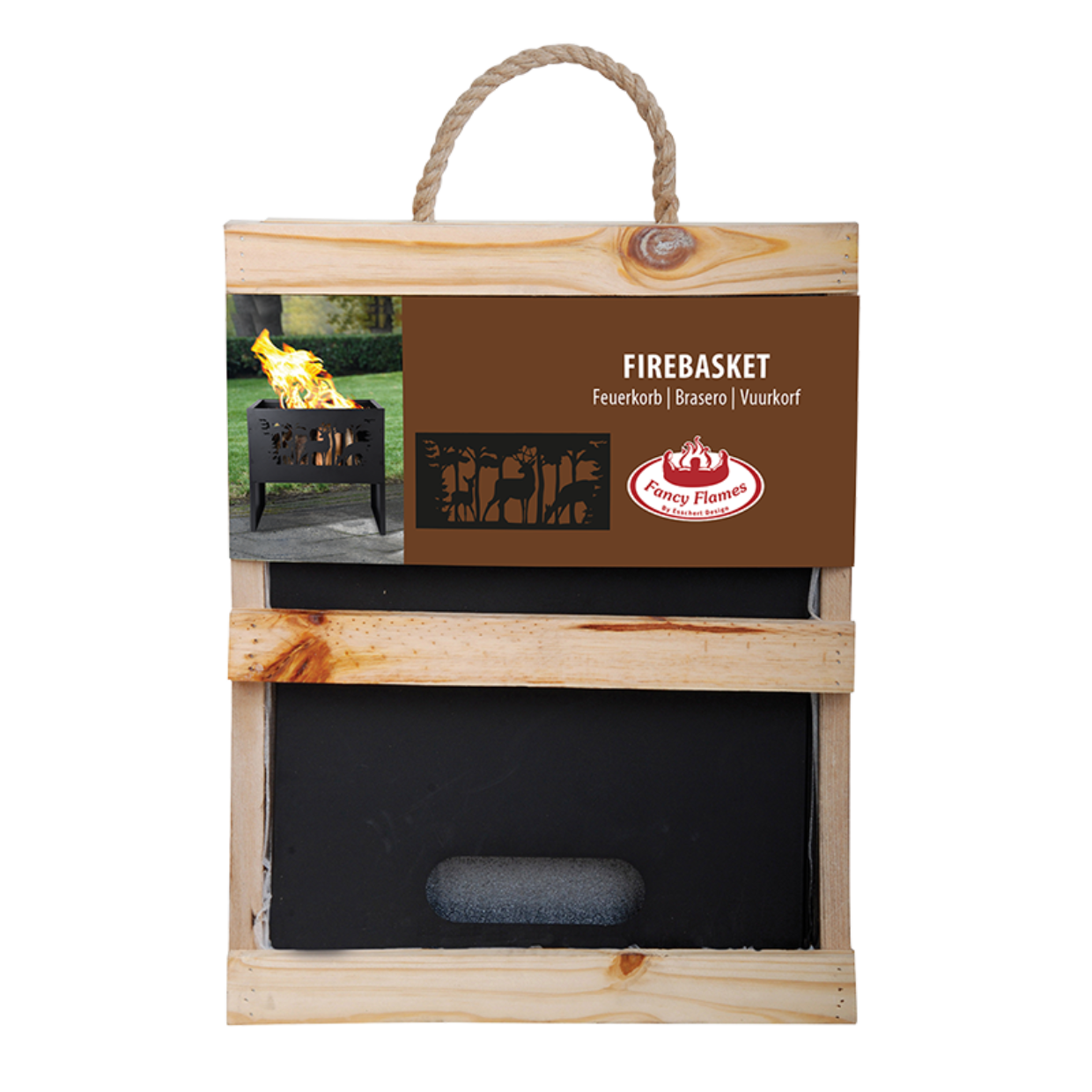 Super flot bålfad i rektangulær form med laserskåret hjorte som skaber fantastiske skygger og passer perfekt til enhver have eller terrasse. Den innovative emballage kan bruges som brænde.