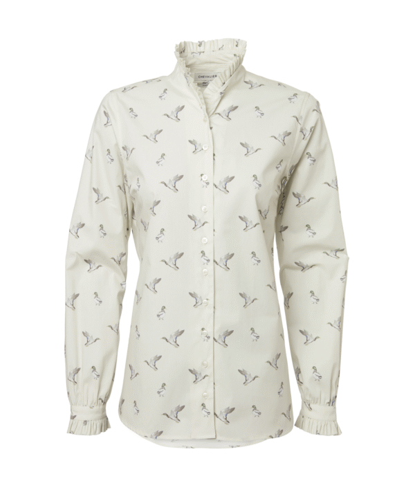 Skjorten er i en lys farve med motiv af ænder og med flæsekanter (model 1060234) er skabt med fokus på optimal bevægelsesfrihed og komfort.