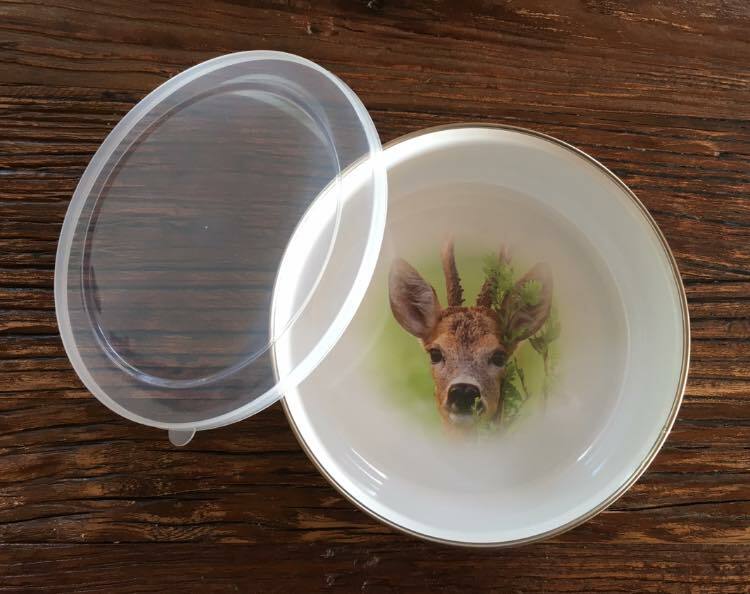 Hyggelig emaljeskål med tryk indvendigt i bunden.