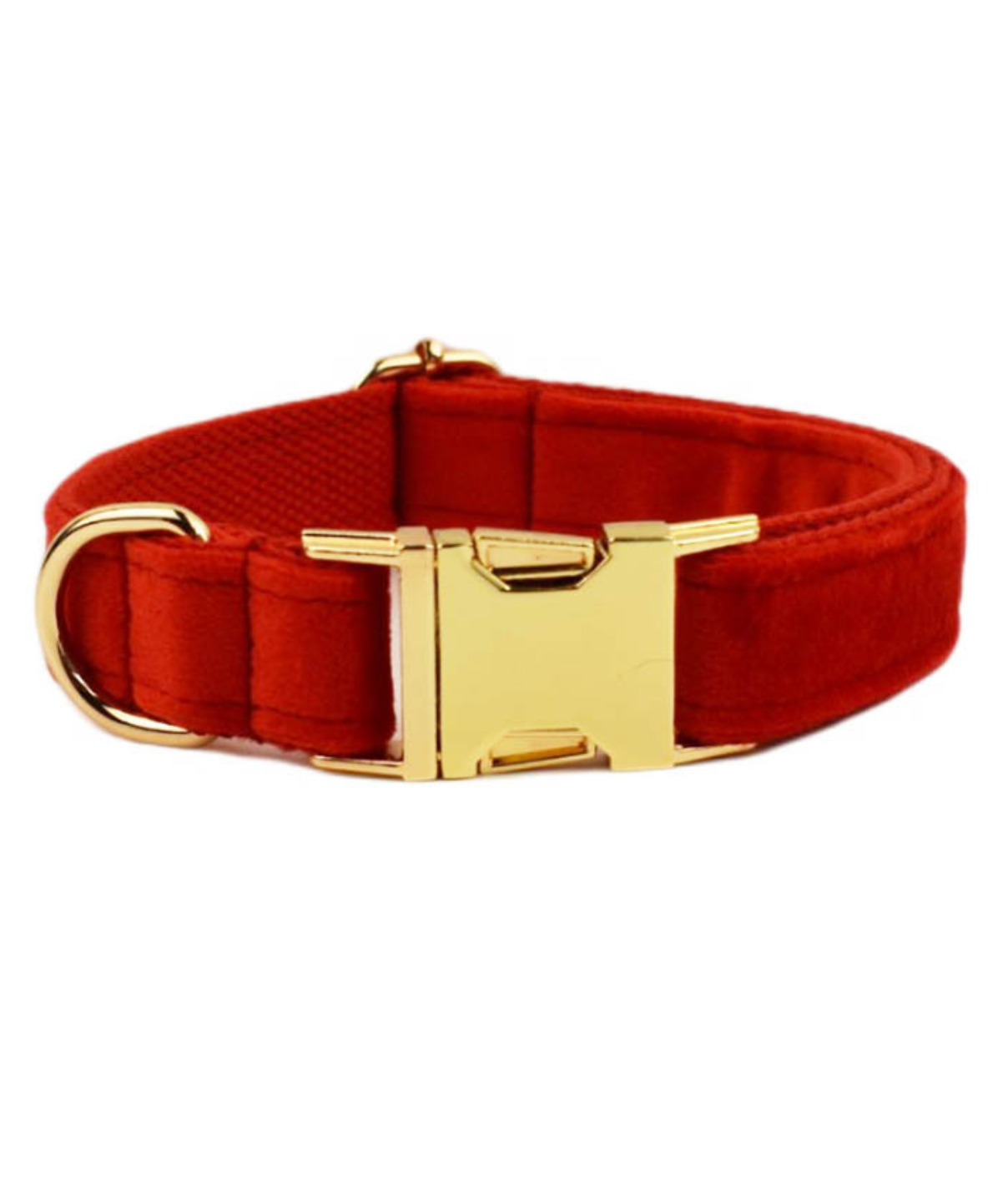 Halsbåndet er i kraftigt lærred med velour i en flot rød farve inkl. gravering direkte på spændet.