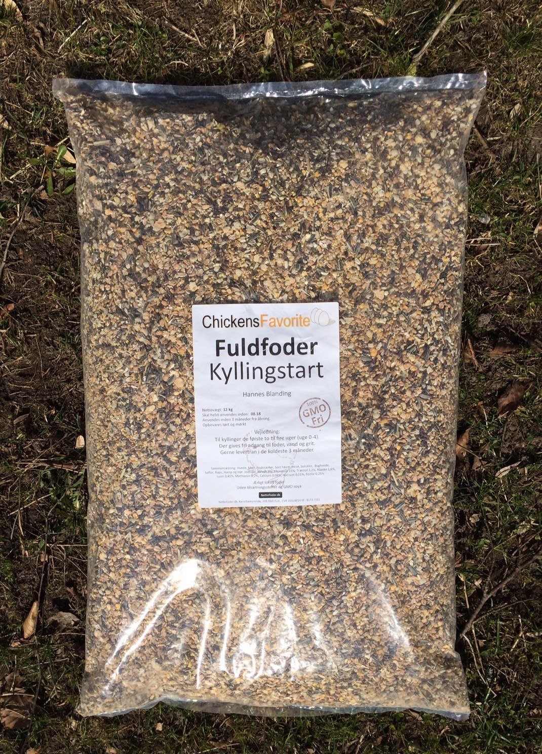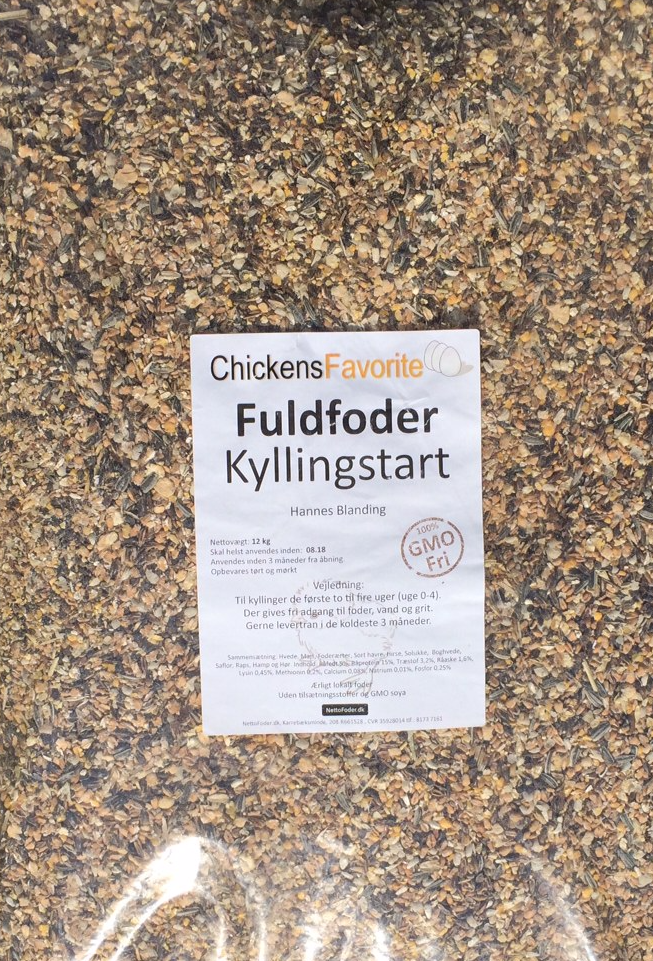 Sammensætning: Kyllingestartfoder/Forblanding, Majs, Foderærter, Raps, Gul og rød Hirse, Afskallet Solsikke, Boghvede, Saflor, Hør, Hamp, nøgen havre, Rød Dari. Indeholder GMO fri soya.