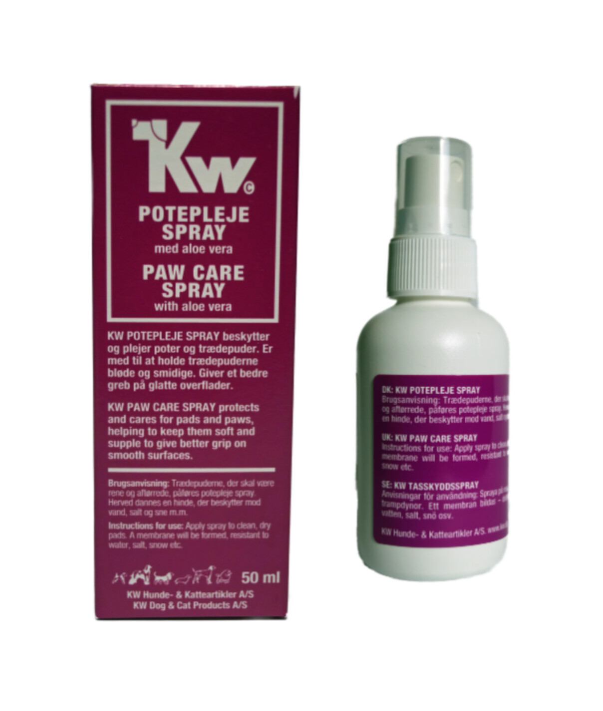 KW POTEPLEJE SPRAY beskytter og plejer poter og trædepuder. Er med til at holde trædepuderne bløde og smidige. Giver et bedre greb på glatte overflader.