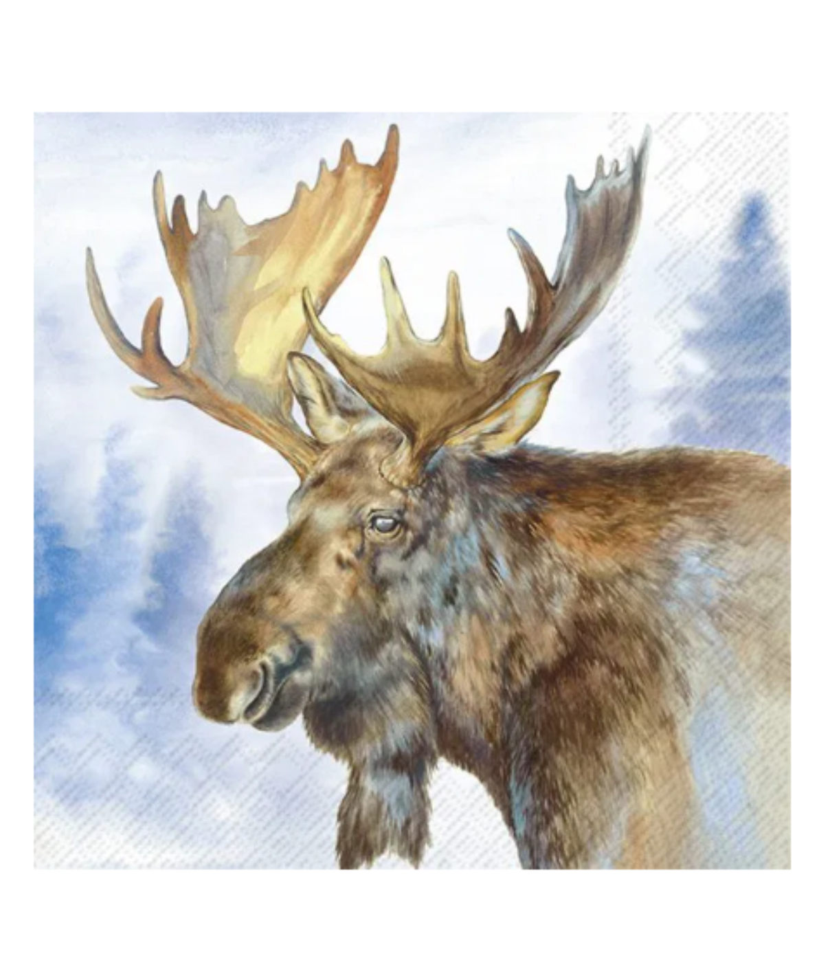 Det harmoniske farveskema med nuancer af blå og naturlige toner skaber en beroligende atmosfære, der passer perfekt til enhver bordindstilling. Det detaljerede motiv fanger den vilde skønhed af elgen og inviterer til samtale ved bordet.