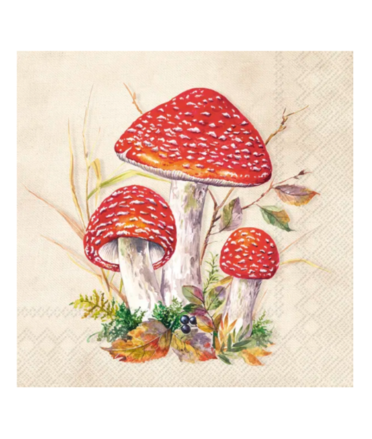 Servietterne har et unikt og farverigt design med den klassiske røde fluesvamp, som står i smuk kontrast til en lys baggrund.