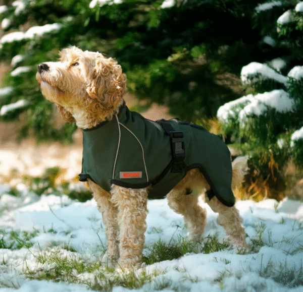 Vandtæt regnfrakke til hunde med et indvendigt lag af bambusfleece, som holder hunden varm i køligt vejr.