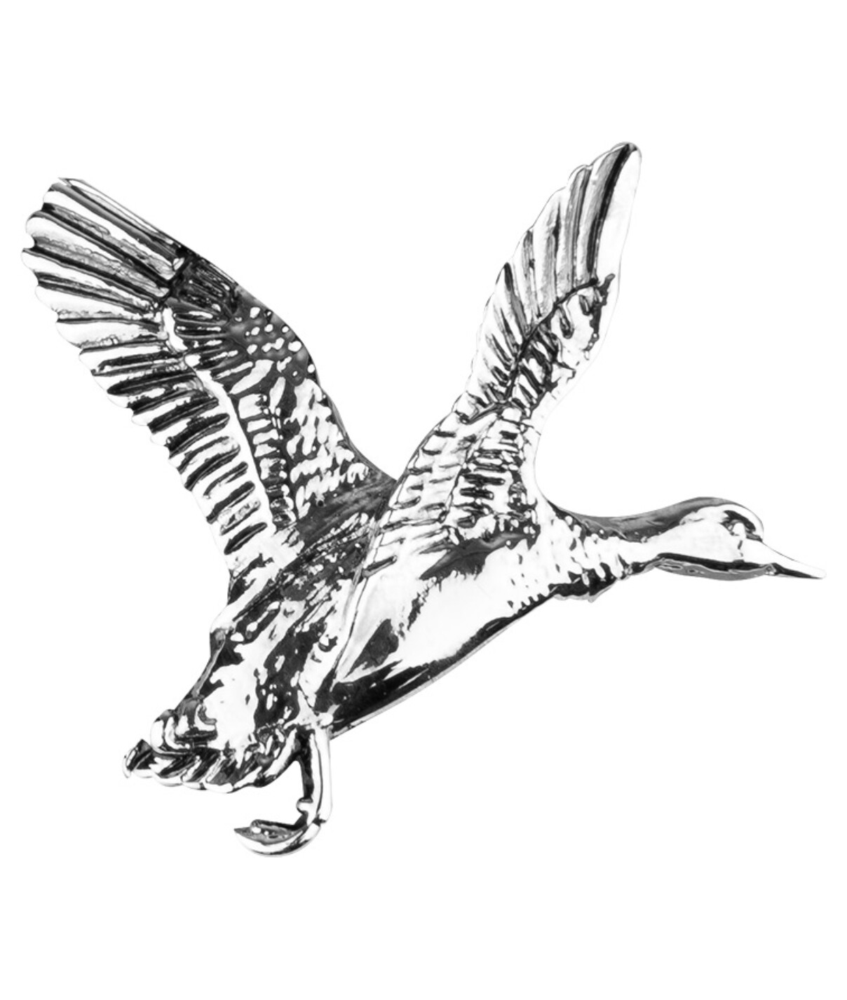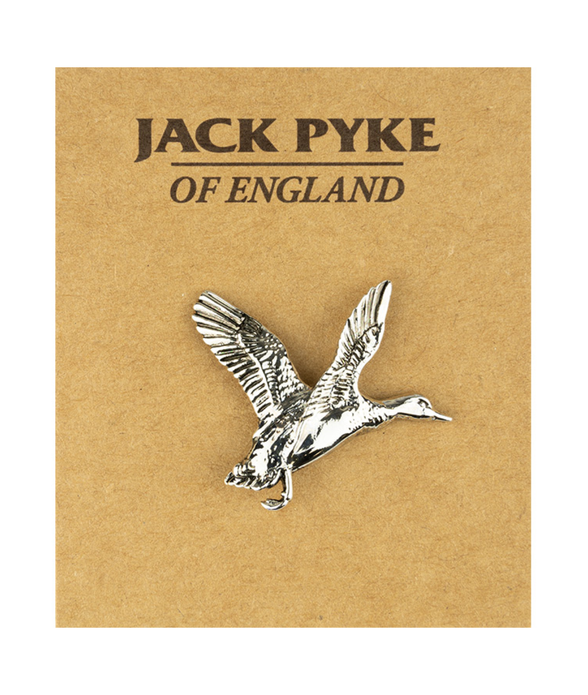 Flotte håndlavede brocher i tin med sikkerhedsclips med motiv af flyvende and fra Jack Spyke.