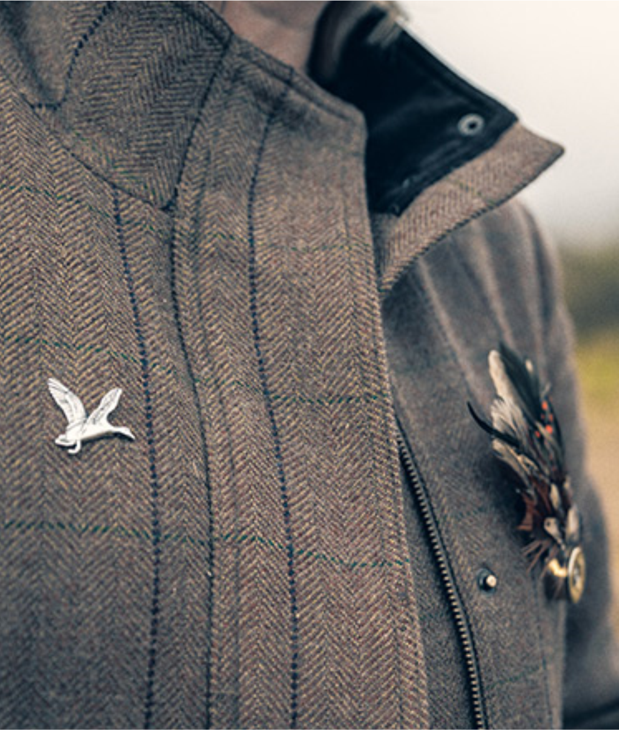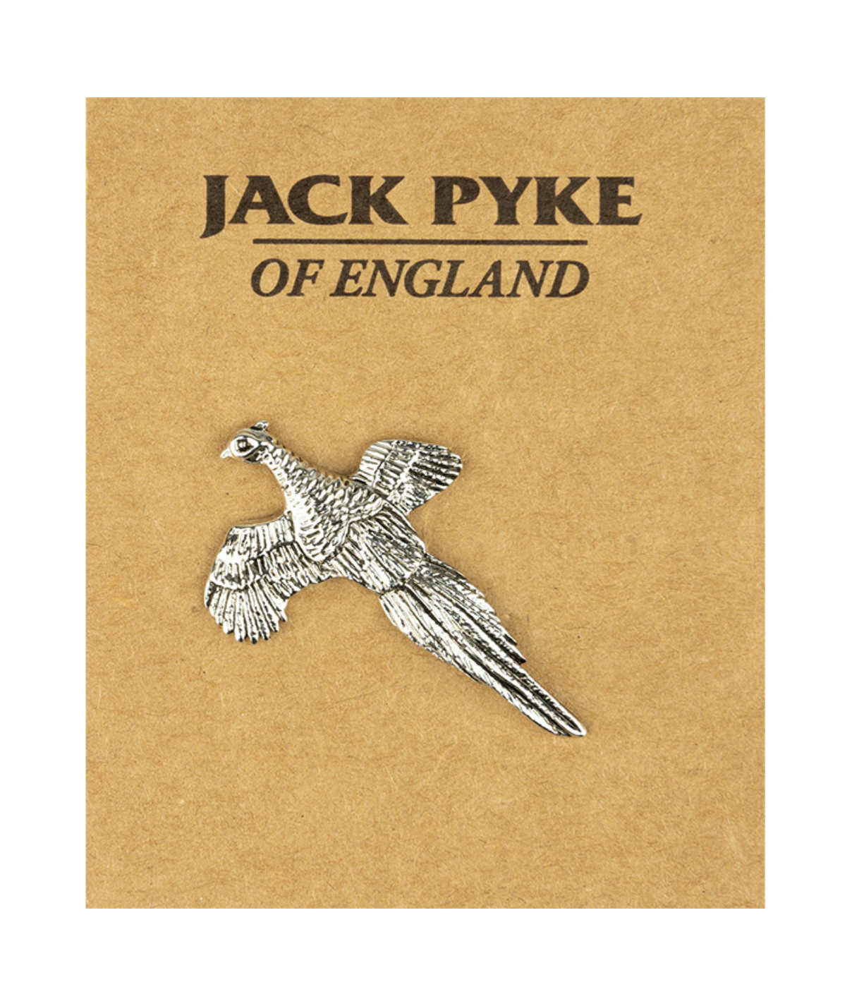 Flotte håndlavede brocher i tin med sikkerhedsclips med motiv af flyvende Fasan fra Jack Spyke.