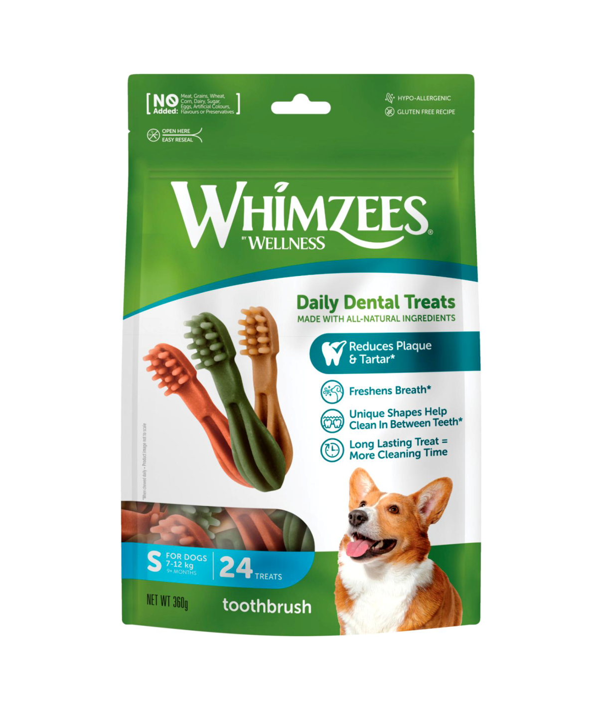 Whimzees tandbørste til mellemstore hunde er en underholdende og effektive “tandbørste” godbidder er sammensat af blot seks nøgleingredienser og bidrager til at fjerne plak, tandsten og reducere de bakterier, der forårsager dårlig ånde.
